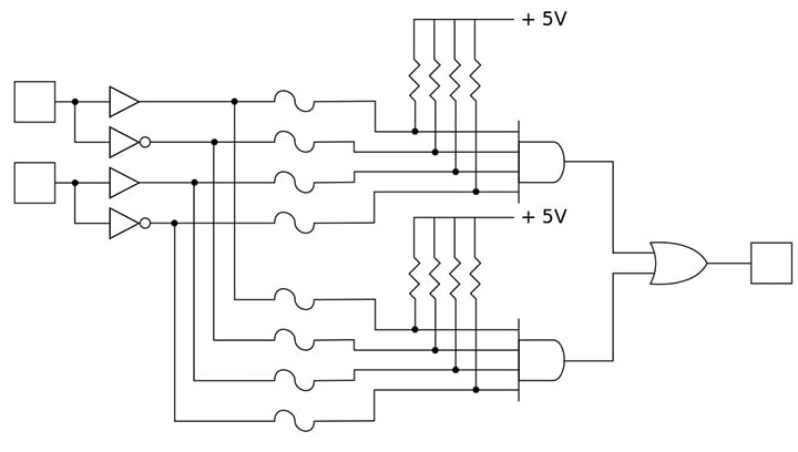 This combination of circuit elements enables the designer to implement a large number of logic functions including clocked sequential logic needed for state machines. PALs are very fast devices that replaced much of the standard logic in previous-generation designs. Figure 1 shows a basic PAL in which the programmable elements (shown as fuses) connect both the true and complemented inputs to the AND gates. The AND gates, which are also known as product terms, are ORed together to form a sum-of-products logic array.
