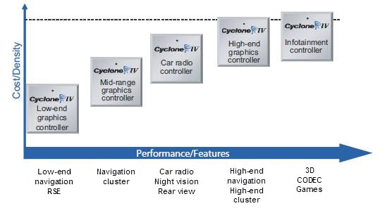 FPGAs implementing graphics controllers have already gained acceptance in automotive electronics in part because as the computational and I/O requirements grow, FPGAs can quickly be reconfigured to meet the new challenges without large non-recurring engineering costs. Figure 4 shows how Altera's Cyclone® IV can be reconfigured to handle increasingly demanding applications.