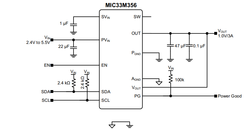 L'interface I2C MIC33M356 permet de programmer la tension entre sortie de 0,6 V et 1,28 V, avec une résolution de 5 mV (-HAYMP et -FAYMP), ou entre 0,6 V et 3,4 V, avec une résolution de 10 mV et 20 mV (-SAYMP). Deux options de tension par défaut différentes (0,9 V et 1,0 V) sont fournies afin que l'application puisse être démarrée avec un niveau de tension sûr, puis déplacée vers des modes hautes performances sous contrôle I2C.